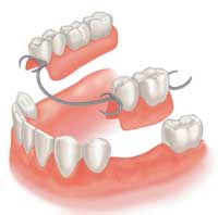 A partial denture or bridge is a removable piece that consists of replacement teeth. It is attached to a pink or gum-colored plastic base which is often connected by metal framework that holds the denture in place in your mouth. Partial dentures are used when one or more natural teeth remain in the upper and lower jaw.